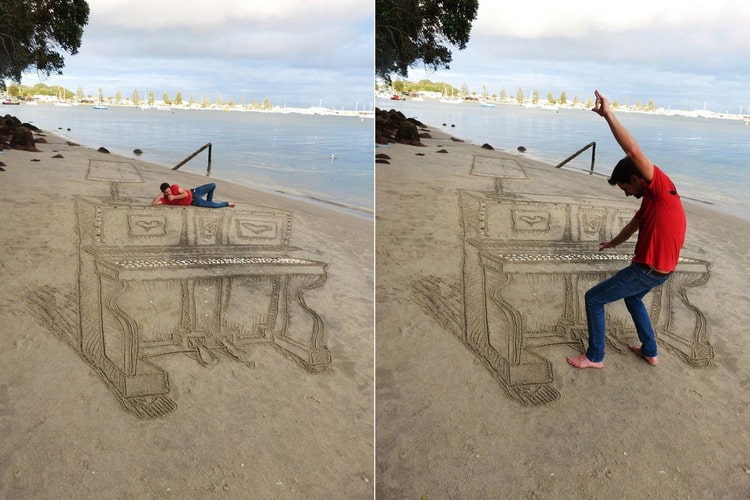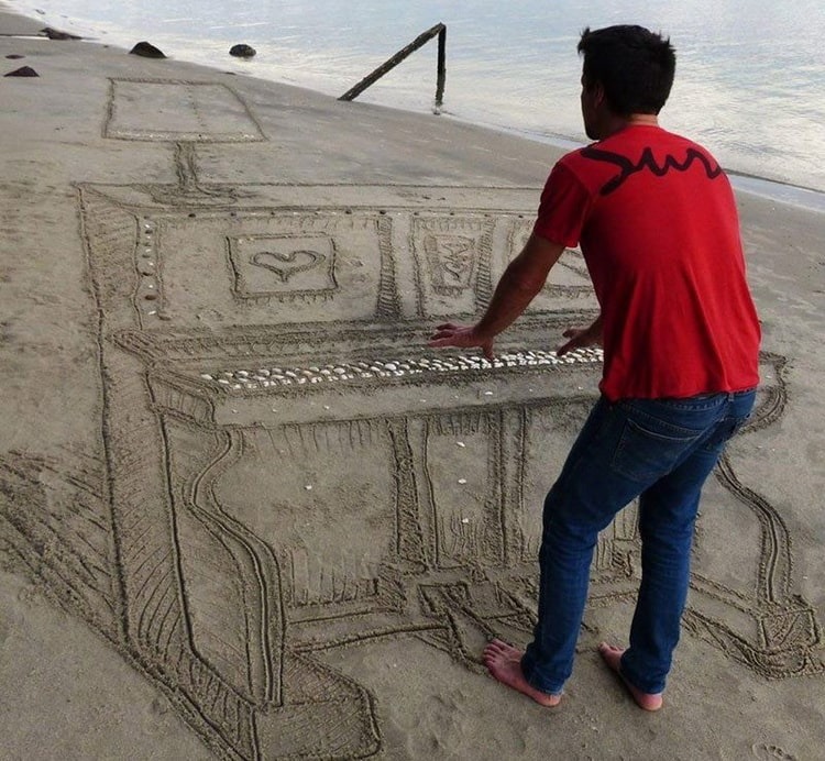 یک جوان باذوق مشغول نواختن با یک پیانوی سه بعدی در ساحل است. البته تا وقتی که جزر و مد، این پیانوی زیبا را از بین نبرده باشد! البته عظمت این طرح وقتی بیشتر مشخص میشود که به تصویر زیر (سمت چپ) توجه کنید...