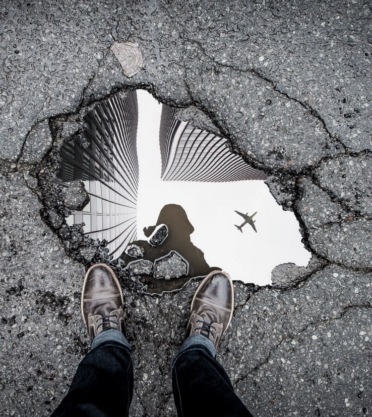 تصاویر آسمان خراشهای شهر و از آن بالاتر، یک هواپیما در آسمان شهر دیده میشود. البته همه و همه تنها در یک گودال آب! این عکس زیبا توسط مارک اولیور جودوین (Marc-Olivier Jodoin) گرفته شده است. عکس کامل را در تصویر زیر مشاهده میکنید: