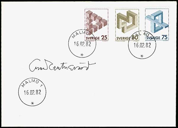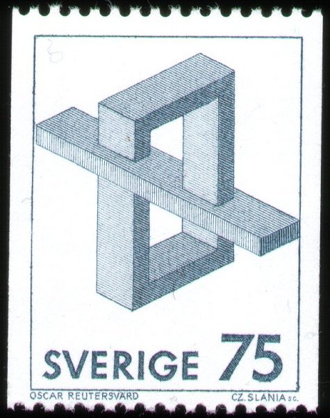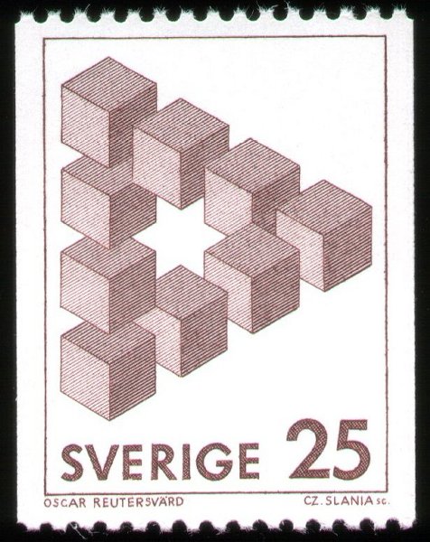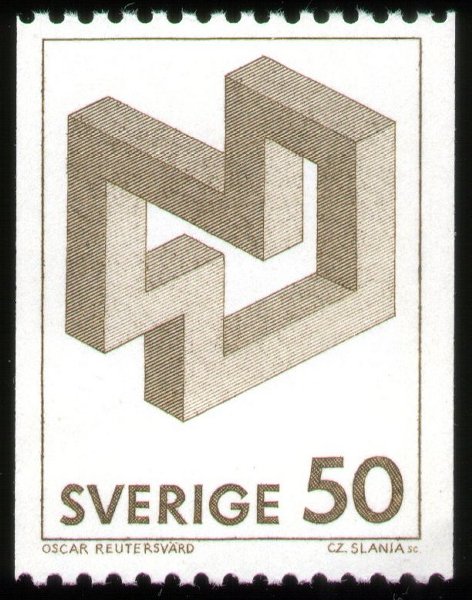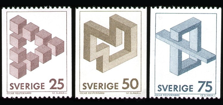 این سه تمبر که به اشکال غیرممکن پرداخته است مربوط به کشور سوئد و سال ۱۹۸۲ میباشد. طراحی این سه تمبر توسط اسکار رویتروارد (Oscar Reutervärd) انجام گرفته است. او طرح مثلث ناممکن را در سال ۱۹۳۴ کشیده است. در اینجا صفحه آرشیو این سه تمبر را نیز مشاهده میکنید: