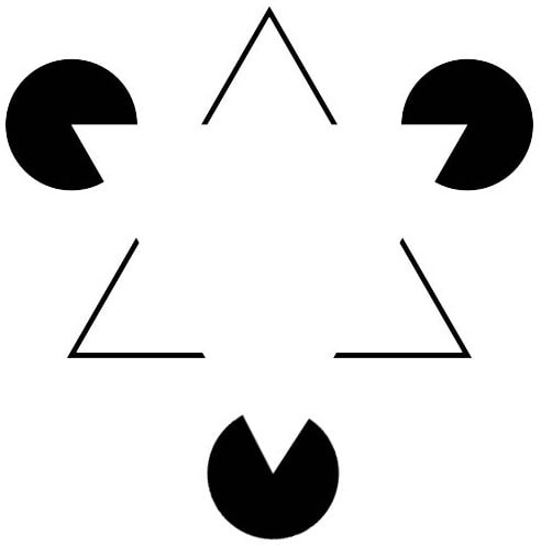 این خطای دید حسی-ادراکی معروف که با عنوان «مثلث کانیزسا» (Kanizsa's Triangle) شناخته میشود، برای اولین بار توسط گایتانو کانیزسا۱ (۱۹۹۳-۱۹۱۳) روانشناس ایتالیایی مطرح شد، از دو نوع مختلف قطعات (تصاویر) تشکیل شده است. علی رغم اینکه این قطعات به هم متصل نیستند، اما نحوه چیدمان آنها، در ذهن، شکل سومی (مثلث سفید) را بوجود آورده که در واقع وجود خارجی ندارد. اما ذهن ما به روشنی آن را می بیند.