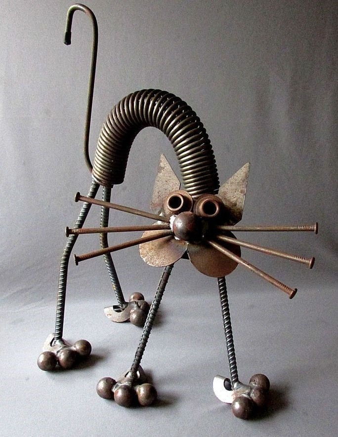 در این گربه بانمک چه میبینید؟ این گربهٔ تمامفلزی از چه چیزهایی ساخته شده است؟ حتی ممکن است تمام اجزاء آن، دورریختنی بوده است اما خالقِ این کاردستی، آن را به یک اثر دوستداشتنی تبدیل کرده و چه بسا همه ما یکی از آنها را برای خودمان میخواهیم!