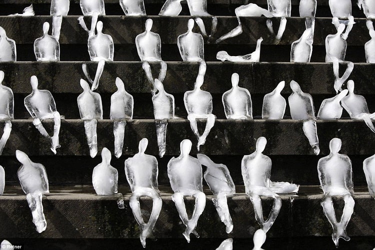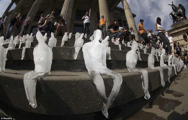 سپتامبر سال ۲۰۰۹ است و هزاران مجسمه مینیاتوری و کوچک در اینجا به منظور جلب توجه بیشتر بشر به ذوب شدن یخها در گرینلند و قطبجنوب به آرامی در یک میدان برلین در حال ذوب شدن هستند. هنرمند برزیلی «نله آزِوِدو» (Nele Azevedo) مجسمههایی از یخ درست کرده و آنها را در پلههایی در میدان مرکزی ژاندارمِنمارک۱ در برلین قرار داده که در ظرف حدود ۳۰ دقیقه شروع به ذوب شدن کردند. دمای هوا هم حدود ۲۳ درجه سانتیگراد بود. این پروژه با حمایت صندوق جهانی طبیعت۲ (بنیاد جهانی طبیعت) صورت گرفته بود. هدف از اجرای این پروژه و برپایی پروژه «مردان در حال ذوب» (Melting Men) بود که هشدار بنیاد جهانی طبیعت مبنی بر ذوب شدن یخهای کره زمین هر چه بیشتر بازتاب یابد. واقعا احتمال دارد آب دریاها تا ۲۱۰۰ بیش از یک متر افزایش یابد. همچنین گرم شدن قطب شمال باعث تغییر آب و هوا در مناطق مختلف جهان و افزایش انتشار گازهای گلخانهای در جو زمین خواهد شد. این هنرمند که فارغالتحصیل هنرهای تجسمی از دانشگاه سائوپائولوی برزیل است، از سال ۲۰۰۵ پروژههای مشابهی را در وسعتهای متفاوت، در کشورهای مختلف جهان برگزار میکند. تا کنون هزاران مجسمه یخی کوچک ساخته شدهاند تا آب شوند و هشداری جدی به ساکنان کره زمین داده شود.