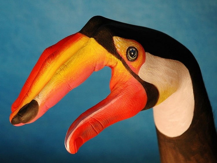 چه توکان زیبایی! مخصوصاً اینکه با ظرافت تمام بر روی یک دست، نقاشی شده است. این رنگآمیزی زیبا توسط هنرمند و نقاش هایپررئالیست ایتالیایی، گایدو دانیله (Guido Daniele) به ثبت رسیده است.