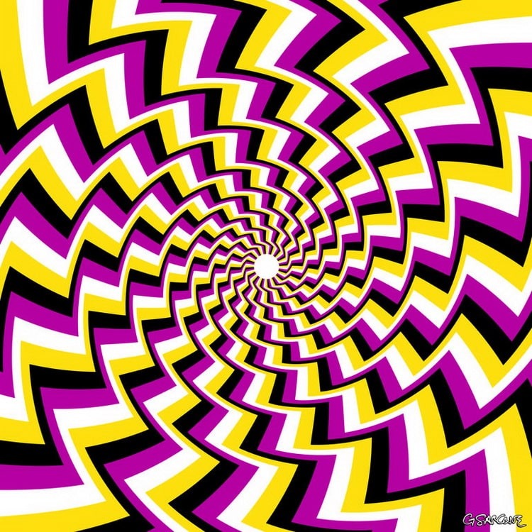 به این تصویر نگاه گنید. یک مارپیچ زیبای زیگزاگی میبینید که از رنگهای رمزآلود زرد و بنفش و مشکی در آن استفاده شده است. این اثر خلاقانه از آثار هنرمند ایتالیایی (متولد سوئیس)، «جیانی سارکونه» (Gianni A. Sarcone) است. اگرچه کل شکل کاملاً ثابت است اما به محض اینکه به آن نگاه کنید، انگار شما را به درون خود میکشد!