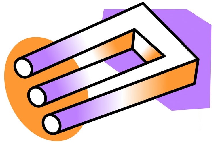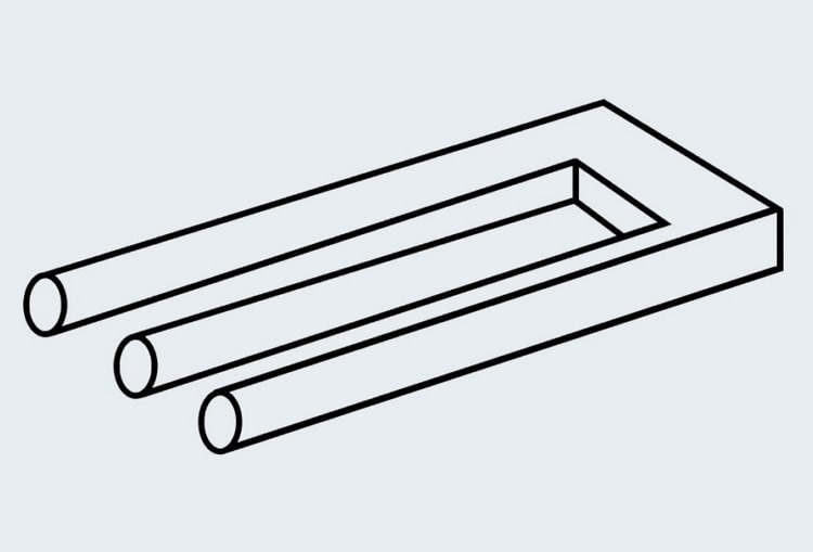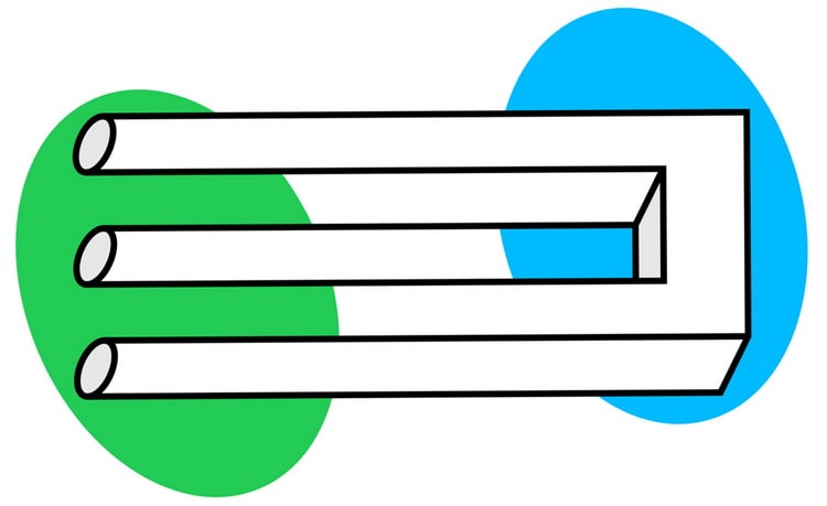 همانطور که در تصویر میبینید، یک طرف شکل، سه استوانه وجود دارد. طرف دیگر هم یک دوشاخه U-شکل مکعبمستطیلی. به صورت مستقل، هیچ مشکلی وجود ندارد. مشکل زمانی بروز میکند که بخواهیم یک سر شکل را به طرف دیگرِ آن مرتبط کنیم و با چشمانمان مسیر استوانهای را دنبال کنیم تا به انتهای شکل برسیم! به طرز مرموزی، «سه استوانه» تبدیل به «دوشاخه» میشود و این همان نقطه تناقض ماجراست!