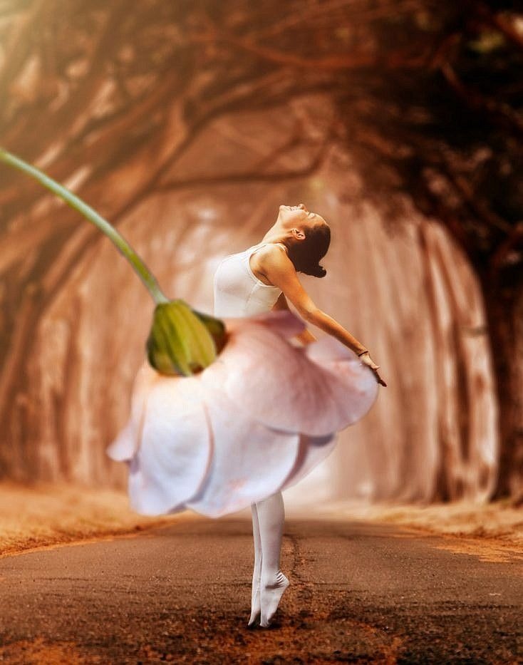 برای ثبت این عکس زیبا در حالت پرسپکتیو مصنوعی، دوربین در زاویه کاملاً مناسبی قرار گرفته، در نگاه اول به نظر میرسد دامن این دختر از گل است اما خیلی زود، ساقهی گل، همه چیز را مشخص میکند :)