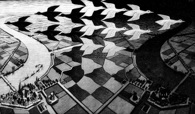 اثری که می بینید با عنوان «شب و روز»۱ توسط هنرمند مشهور هلندی، موریس کرنلس اِشِر۲ در سال ۱۹۳۸ کشیده شده است. اشر با استفاده از کاشیکاریها و نقوش پسزمینه، تضادها و ترکیب رنگهای سفید و سیاه، دستهای از پرندگان سفید را به تصویر کشیده که از میان آنها پرندگانی سیاه نیز به سمت مخالف در حرکتند.