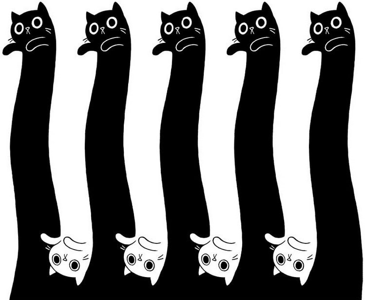 به این گربهها نگاه کنید، تعدادی گربههای عجیب و دراز. بعضی سیاه و بعضی هم سفید. شما در اولین نگاه متوجه کدامشان شدید؟ این گربههای سیاه و سفید دقیقا نگاتیو یکدیگر هستند.