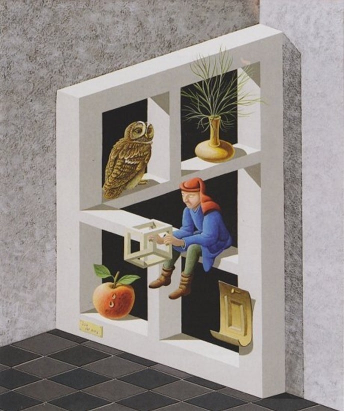 در گوشهای از یک اتاق، طاقچهها و قفسههایی میبینیم. وقتی بیشتر دقت کنیم متوجه میشویم که به یک طرح غیرممکن نگاه میکنیم. بخشهای مختلفی از این نقاشی، از اشیائی استفاده شده که در واقعیت نمیتوانند وجود خارجی داشته باشند. غیر از خود شِلفها، مکعبی که دست پسرک است هم ناممکن است. آیا باز چیزهای ناممکن دیگری در این تصویر میبینید؟