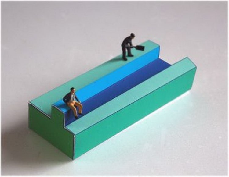 دو مرد در دو طرف یک سکو قرار دارند. یکی از آنها در سمت چپ، بر روی بخش پلهایشکل نشسته و دیگری هم در سمت راست در کنار یک کانال ایستاده است؛ اما واقعا چطور ممکن است؟! به نظر این کانال به آن پله روی سکو به طرز ناممکنی متصل شده! و تنها وقتی که به یکی از دو سر این سکو نگاه کنید مشکلی با آن نخواهید داشت.
