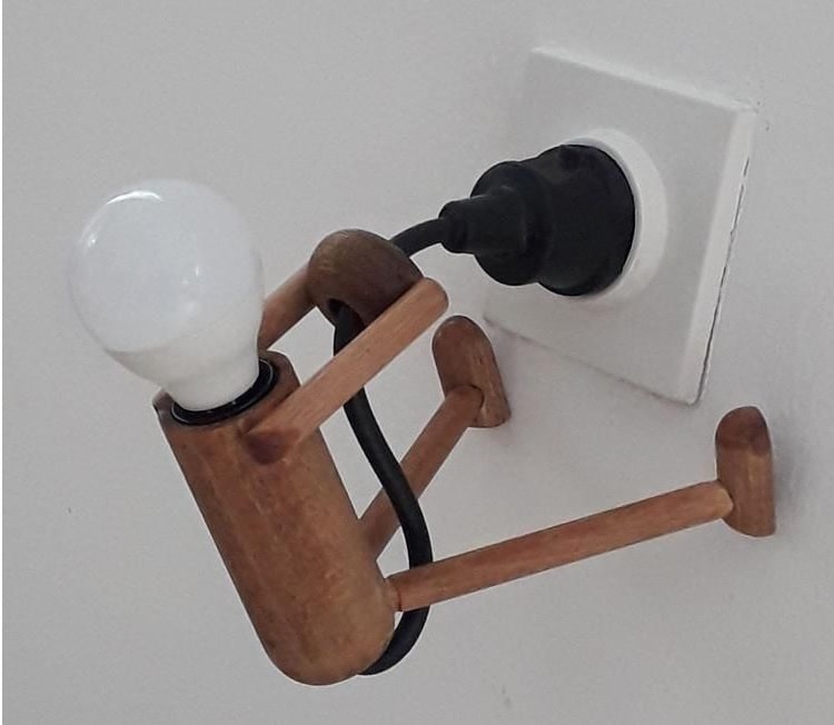احتمالا این چراغ سعی میکند از وضعیت متصل به برق، خودش را آزاد کند! یک طرح بسیار زیبا و خلاقانه برای استفاده از یک چراغ دَمِ دستی! حالا چرا خاموش است؟! یا برق رفته، یا در طرف دیگر آن که نمیبینیم یک کلید خاموش و روشن وجود دارد. و البته یک احتمال سومی هم وجود دارد. اینکه لامپ سوخته است! شما چه فکر میکنید؟ آیا حالت دیگری هم متصور است؟