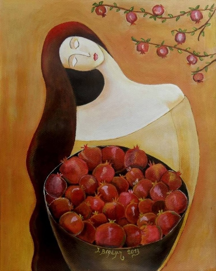 دختری یک سبد پر از انار به دست گرفته، احتمالا میخواهد آخرین شب یلدای قرن را جشن بگیرد! این نقاشی زیبا با عنوان «دختری با انارها» (Girl with Pomegranates) از آثار نقاش یونانی، ایوانا ورمی (Ioanna Veremi) است. نام دیگر این اثر «رودولا» است که در سال ۲۰۱۳ کشیده شده است.