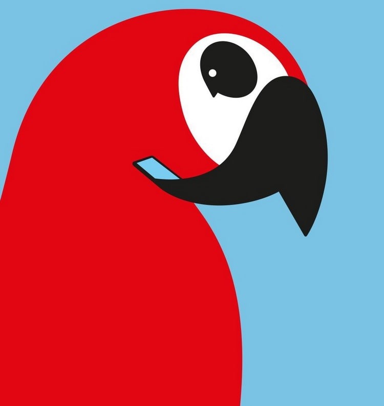 یک طوطیِ تمامقرمز با یک نوک مشکی میبینیم. ترکیب نوک و چشم طوطی هم تصویر یک مردی را نشان میدهد که در دستش، یک موبایل (یا تبلت) دارد و به صفحه نمایش آن نگاه میکند. موضوع جالب دیگر اینکه رنگهای به کار رفته در تصویر، دو به دو در تقابل با هم هستند: سفید و سیاه؛ آبی و قرمز.