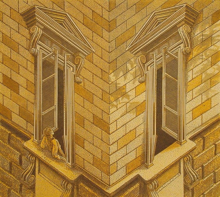 بخشی از یک ساختمان نسبتاً مجلل را میبینید. دو پنجره بر روی دو دیوار این ساختمان میبینید. فردی به یکی از این پنجرهها تکیه داده است. هنگامیکه به پایین این پنجره نگاه کنیم، پنجرهها رو به داخل باز شدهاند اما بالای آن به سمت بیرون باز شده است.