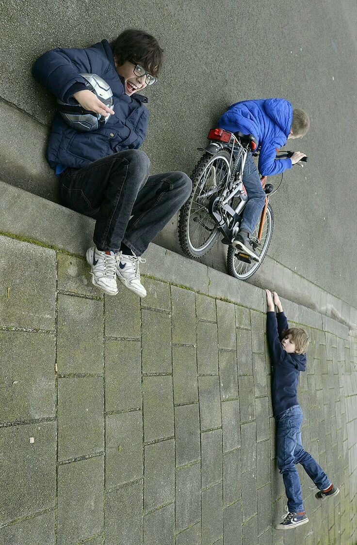 بازهم از آن عکسهای دلهرهآور. سه دوست قصد داشتند با هم بازی کنند. اما به نظر تصمیم گرفتند از گذرگاه باریک و خطرناکی عبور کنند. اما یکی از دوستان پایش سُر میخورد و در آخرین لحظه موفق میشود به جایی چنگ بزند و فعلا سقوط نکرده ولی در وضعیت ناپایداری به نظر میرسد. در همین حال، یکی از این دوستان که توپی را هم در بغل دارد، به صورت شیطنت آمیزی خوشحال است. اما چرا؟! دوست دیگر هم که با دوچرخه اش سعی دارد تعادل خودش را حفظ کند اما به نظر قصد دارد خودش را از معرکه نجات دهد و فرار کند! فقط امیدواریم از روی دستانِ دوستِ در حالِ سقوطش، رد نشود!