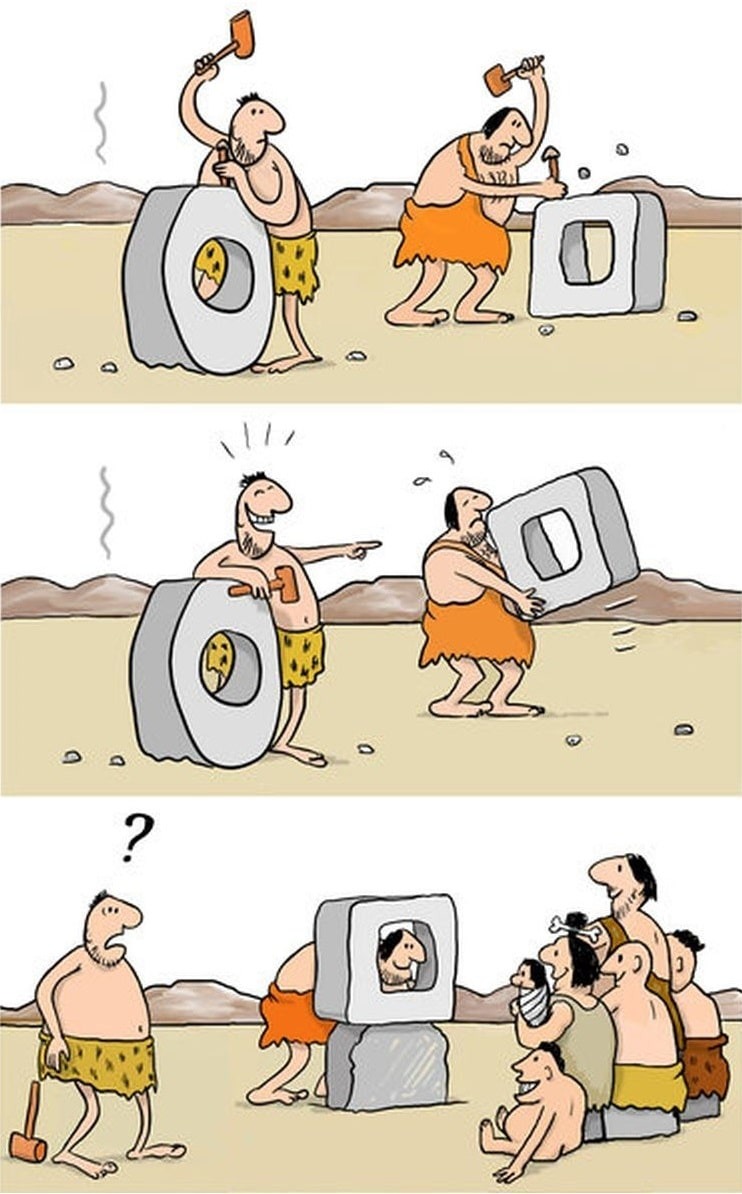 فریم دوم: مرد شماره ۱ با دیدن آنچه دوستش از سنگ تراشیده، خندهاش میگیرد. آخر این هم شد چرخ؟! هنوز نمیدانی که باید آن را بصورت گرد درآوری تا بتواند به راحتی بر روی زمین بچرخد و حرکت کند! بهتر بود ببینی من چه میکنم و تو هم همانکار را انجام میدادی!