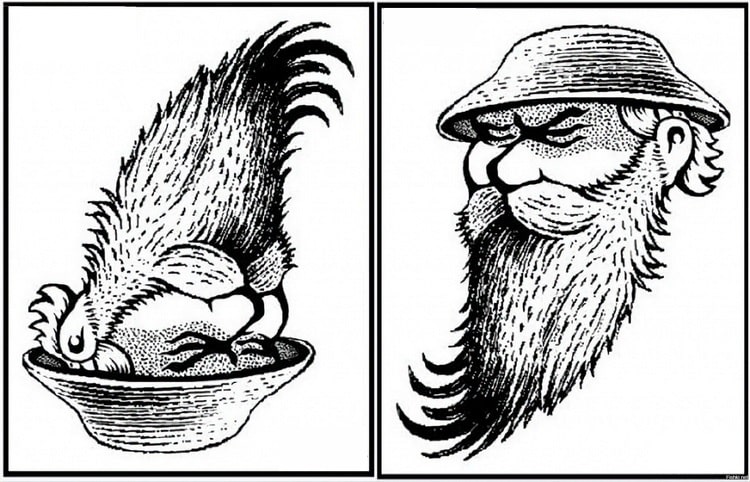 ظرفی پر از دانه داریم و خروسی هم حسابی مشغول خوردن است. آیا در همان نگاه اول، برداشت دیگری از این تصویر دارید؟ اگر تصویر را ۱۸۰ درجه بچرخوانیم، تصویری کاملاً متفاوت خواهیم یافت. . . . . . هر دوی این تصاویر را کنار هم مشاهده میکنید: