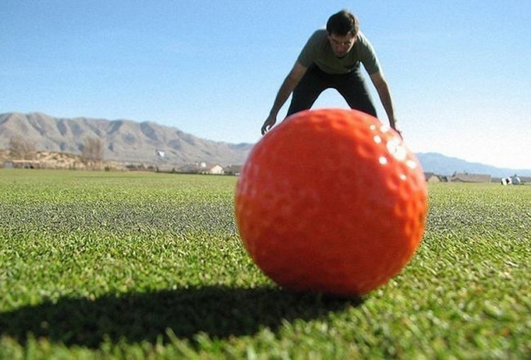 در این تصویر، در نگاه اول به نظر میرسد که مردی قصد دارد یک توپ بسیار بزرگ و سنگین را بردارد، ولی در واقع این توپ، یک توپ معمولی گلف است! در خلق تصاویر پرسپکتیو مصنوعی، پارامتر زاویه عکس بسیار تعیینکننده است. اصطلاح معروف «زمانِ درست در جایِ درست» مخصوصا برای ثبت تصاویر خلاقانه پرسپکتیو متحرک و وابسته به زمان، بسیار بهکار میرود.
