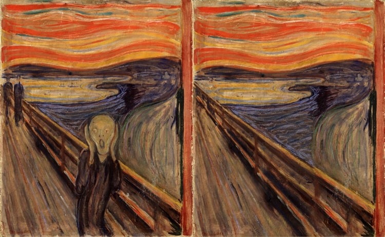 به عنوان مثال، همانطور که در بالا میبینید، شخصیت اصلی نقاشی «جیغ»۱ اثر نقاش معروف نروژی «ادوارد مونک» (Edvard Munch) حذف شده است. به نطر میرسد مدتی در خانه خواهد ماند و بعداً دوباره به جیغ معروفش ادامه خواهد داد!