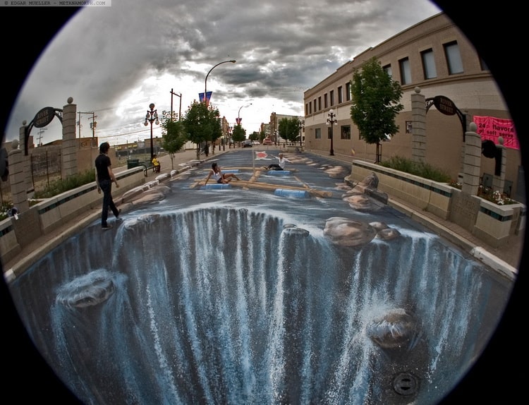 این پروژه اولین کار ادگار مولر (Edgar Müller) است که در ابعاد بزرگ اجرا شده است. این پروژه در سال ۲۰۰۷ در خیابان «رودخانه»۱ در شهر «موس جاو»۲ که در جنوب مرکزی استان «ساسکاچوان»۳ کانادا قرار دارد و به مناسبت فستیوالی که در آن سال با عنوان «پریری آرتس»۴ برگزار شده بود، اجرا گردید. ادگارد مولر با کمک برخی هنرمندان محلی، «خیابان رودخانه» را به یک رودخانه بزرگ که به یک آبشار ختم میشد تبدیل کرده بودند! مساحت کل این کار حدود ۲۸۰ مترمربع بود.