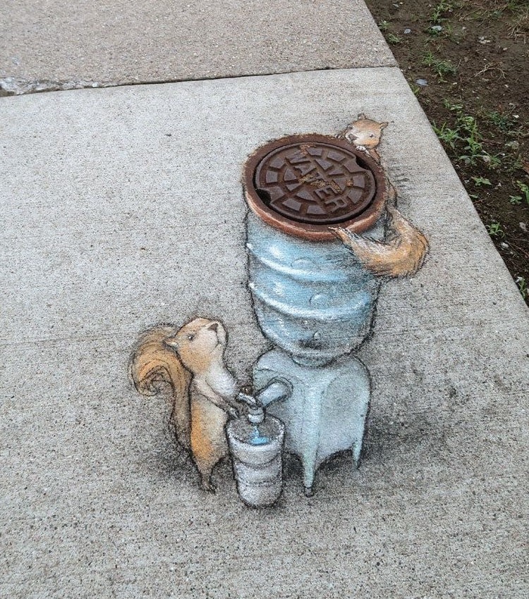 به نظر دو سنجاب تشنه در یک پیادهرو، به یک مخزن آب آشامیدنی (آبسردکن) رسیدهاند و میخواهند سیراب شوند! یک درپوش فاضلاب در پیادهرو کافی است که ذهن خلاق یک هنرمند خیابانی را به خلق این اثر، ترغیب کند.