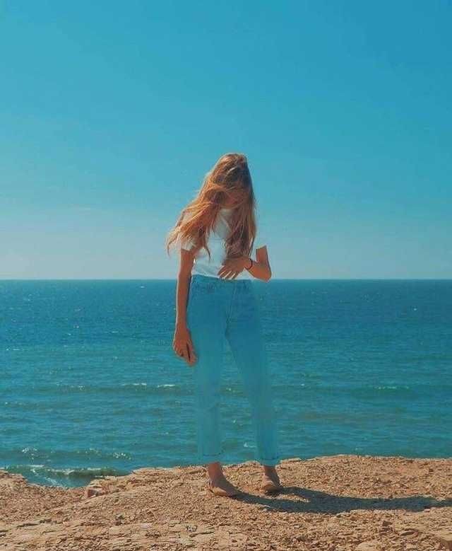 این خانم با انتخاب محل مناسب، از تشابه رنگ شلوارش با دریای نیلگون، استفاده کرده است. قطعاً فاصله و زاویه مناسب عکاسی در ثبت این عکس، بسیار مهم و کلیدی بوده است.