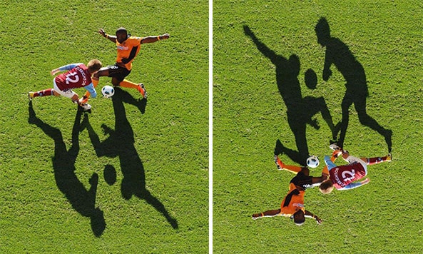 در شکل زیر، عکس اصلی نیز پیشِ روی شماست. خودتان قضاوت کنید. آیا سایهها واضحتر بازی نمیکنند؟! البته به نظر یکی از سایهها کمی خشن است و یک تکل خطرناک بر روی پای سایه حریف انجام داده است!