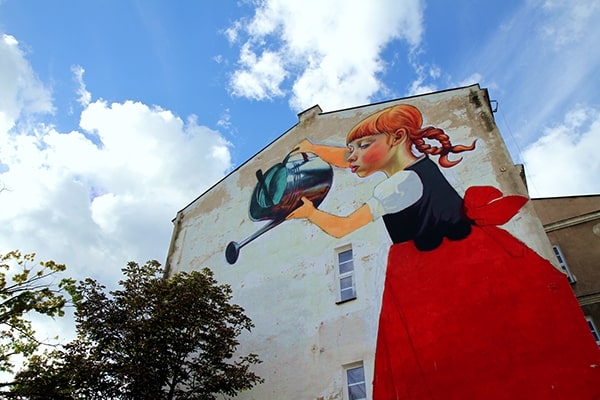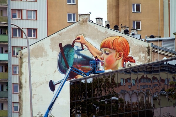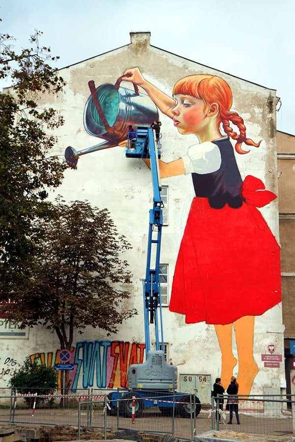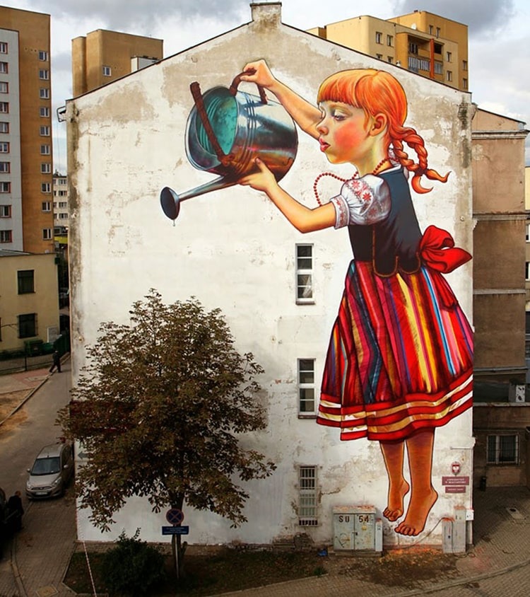 به این دختر غولپیکر که لباس سنتی لهستانی به تن دارد و بر روی دیوار یک ساختمان نقش بسته نگاه کنید. او در حال آب دادن به یک درخت در باغچه پشت این ساختمان است. نام این محله، بیالیسوک (Białysok) است و در جشنوارهای به همین نام برگزار شد. نام این اثر هم «افسانه غولها» تعیین شد. ناتالیا راک (Natalia Rak) یک هنرمند و نقاش خیابانی لهستانی و متولد ۱۹۸۶ است. وی از دانشگاه هنرهای زیبای لودز لهستان فارغ التحصیل شد. پروژههای ناتالیا راک در سراسر اروپا به نمایش گذاشته شده است. او تاکنون در برخی از معتبرترین رویدادهای هنری خیابانی این قاره شرکت کرده است. بارزترین قطعه او، همین نقاشی دختر جوان است. از زبان خود او مطالبی را میخوانیم: وقتی شروع به ترسیم طرح کردم، باید عناصری از منطقه را در نظر میگرفتم، برای مثال پنجرهها و درختی که در حال رشد بود. نباید آن را قطع میکردیم. سازماندهندگان، متنهایی درباره افسانههای لهستانی از آن منطقه را به من داده بودند. من به طور خاص، افسانه غولها را دوست داشتم: آنها ابتدا دنیای اطراف خود را نابود میکنند اما بعداً رفتار انسانها تقلید کرده و شروع به مراقبت از طبیعت میکنند. من فکر کردم که چگونه درخت را در طرح خود بگنجانم. میخواستم یک دختر کوچک ساده و شیرین که از درخت مراقبت میکند را نقاشی کنم. در ابتدا برگزارکنندگان میخواستند درخت را قطع كنند تا دیوار را نقاشی كنیم، اما بعد از آنكه ایده خود را به آنها گفتم، خوشبختانه دیگر نیازی به این کار نبود. ایده من پذیرفته شده بود. وقتی شروع کردم، بیش از ۱۰۰ قوطی داشتم. من همیشه از رنگهای اکریلیک در زمینه استفاده میکنم و سپس با استفاده از اسپری، جزئیات را ترسیم میکنم. من روزانه ده ساعت کار میکردم و پس از هفت روز این نقاشی دیواری به پایان رسید. هر روز هم باران میبارید اما بسیار خوشبین و پر از امید بودم. بعد از یک کار سخت، پروژه تمام شد. اسم این شخصت دوستداشتنی را هم «ماریسیا» (Marysia) گذاشتم. من فکر میکنم این نقاشی دیواری شروع خوبی برای توسعه مناطق سبز و توجه هرچه بیشتر به طبیعت است. اگر درخت را میبریدیم، بسیار ناراحت میشدم. در اینجا برخی از روند طراحی این دختر هنرمند لهستانی، دیده میشود:
