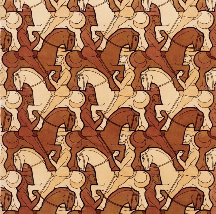 اثری که میبینید با عنوان «مرد اسبسوار / سوارکار» (Horseman) توسط هنرمند نابغه هلندی، موریس کرنلس اِشِر در سال ۱۹۴۶ کشیده شده است. اشر با استفاده از تضادها و ترکیب رنگهای نسبتاً متضاد، دو گروه سوارکار را به تصویر کشیده که در دو سوی مخالف هم در حرکتند. آنچه دوستداران آثار موریس اشر را شیفته خود کرده، استفاده از تقارن، تکرار (با مفهوم بینهایت) و تضاد است.
