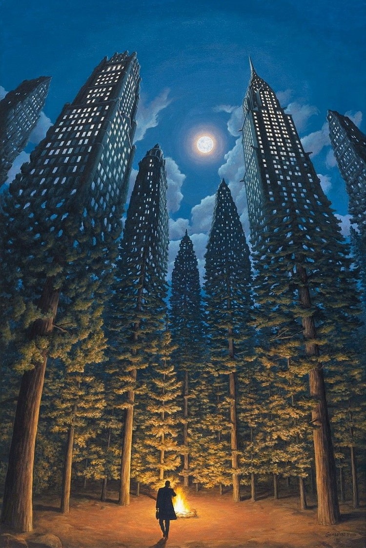 در وسط یک جنگل تاریک، آتشی افروخته شده و مردی به آن نزدیک میشود. به نظر میرسد درختان جنگل سر به فلک کشیدهاند؛ اما بهتر است کمی بیشتر تامل کنیم! امتداد درختان ما را به آسمانخراشهای بلندی میرساند؛ به عبارت دیگر درختان جنگل، در آسمانخراشها محو شدهاند.